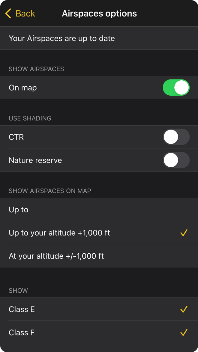 Class filter: Airspaces classified as A, B, C, D, Danger, Prohibited, Restricted, CTRs, TMZ and MATZ (MIL) will always be shown on the map. Additionally, you can choose to display other airspace classes by tapping on them in this list. A yellow checkmark will indicate that they are selected.