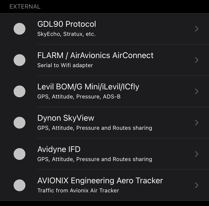 External: Third-party hardware connected via Bluetooth, Wi-Fi, or cable (e.g., external GPS receivers, ADS-B devices).