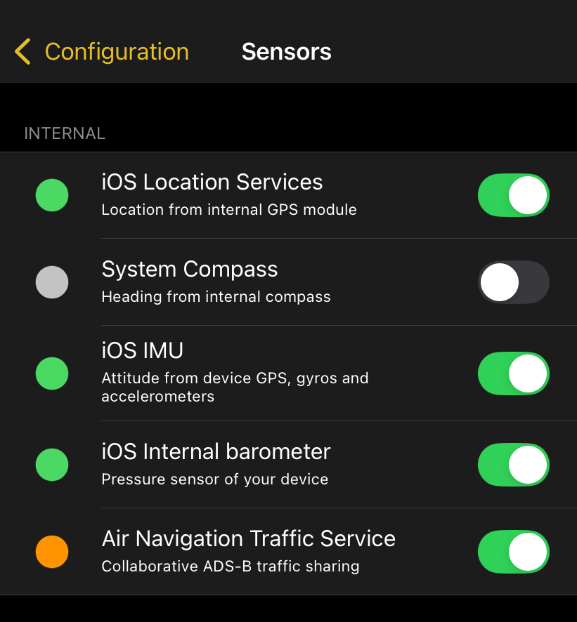 Internal: Built-in sensors of the device (e.g., GPS and barometer). These provide position, altitude, heading, and speed information directly from your device.