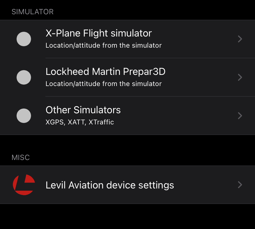Levil Aviation device settings: This section allows you to configure and manage Levil Aviation wireless devices such as the BOM, G Mini, iLevil, or iLevil3. These devices provide GPS, AHRS (Attitude and Heading Reference System), and pressure data to enhance flight information and situational awareness. Make sure your device is properly connected via Wi-Fi and recognized by the app to ensure accurate data transmission.